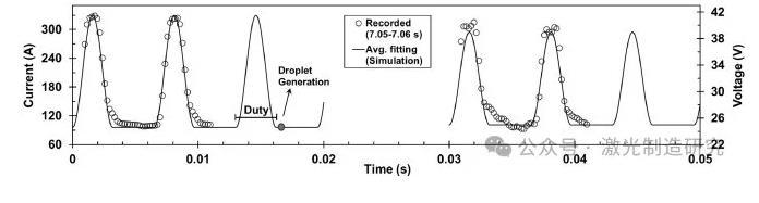 其中,I 1、I 2和P d分別是背景電流、脈沖電流和總波形的脈沖占空比,模擬電流和電壓的相關(guān)波形如圖7所示。記錄的每個電極的平均功率為4957 J/s,與模擬的平均功率4740 J/s相比,證實(shí)了該模型在5%誤差內(nèi)的準(zhǔn)確性。在整個模擬時間內(nèi),一旦脈沖在每個周期結(jié)束,液滴產(chǎn)生時間就與波形同步。
