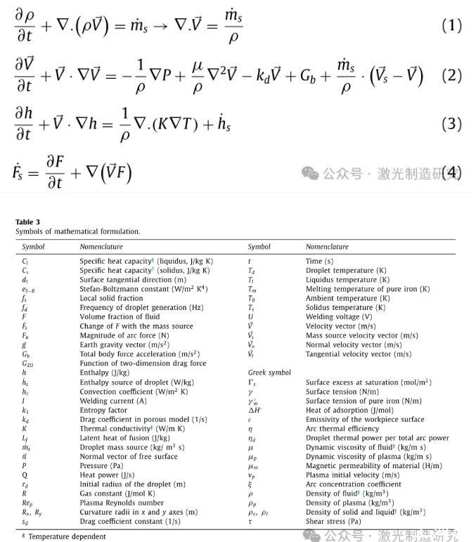 開發(fā)了一個三維笛卡爾模型來分析TP-GMAW工藝獲得的熔池中的輪廓和對流。在支持相變能力的計算域中考慮牛頓和不可壓縮流體的層流。熔池由電磁力、浮力和表面張力共同驅(qū)動。為了簡化數(shù)值模型,等離子體熱對液滴的影響通過液滴的初始溫度來考慮。根據(jù)這些假設(shè),總共四個控制方程(包括質(zhì)量連續(xù)性、動量連續(xù)性(納維爾-斯托克斯)、能量守恒和VOF)根據(jù)方程一起求解。分別為(1)至(4)。表3列出了一系列變量。為了分析熱傳遞和熔池輪廓,采用了FLOW-3D商業(yè)軟件,特別是因為該軟件通過拉格朗日VOF平流法跟蹤移動的自由表面具有很高的精度。