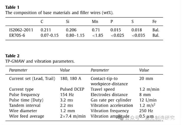 在IIT海得拉巴使用機(jī)器人TP-GMAW設(shè)施進(jìn)行焊接實(shí)驗,其中兩個電極分別通過焊槍饋送并從兩個獨(dú)立的電源接收電力。電源以反相方式同步,以防止后電弧和前電弧之間的相互作用。氬氣82%–二氧化碳18%用作保護(hù)氣體。機(jī)器人焊接設(shè)備由KUKA公司的KR30六軸機(jī)器人組成,該機(jī)器人與Fronius公司的兩個數(shù)字焊接電源相連。跟蹤電極和引導(dǎo)電極的電流設(shè)置為180 A.通過保持焊槍垂直于工件,在平面位置進(jìn)行長度為200 mm的堆焊。本研究中使用的基材是由鐵素體-珠光體結(jié)構(gòu)組成的熱軋低碳鋼IS 2062-2011。絲狀電極是直徑為1.2毫米的ER 70-S。母材和焊絲的化學(xué)成分列于表1。使用容量為150±0 kgf的Sdyn電動振動機(jī)來產(chǎn)生振動。