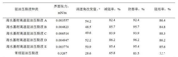 mN/m,潤濕角改變值≥40°,減阻率≥70%,防膨率≥90%,阻垢率≥80%。從表2中數據可以看出,新研究的海水基耐高溫驅油壓裂液,在實驗溫度180℃條件下,各項指標均達到海上油田的要求;在相同條件下,其界面張力值、潤濕角改變值、減阻率、防膨率、阻垢率均優于常規驅油壓裂液產品。