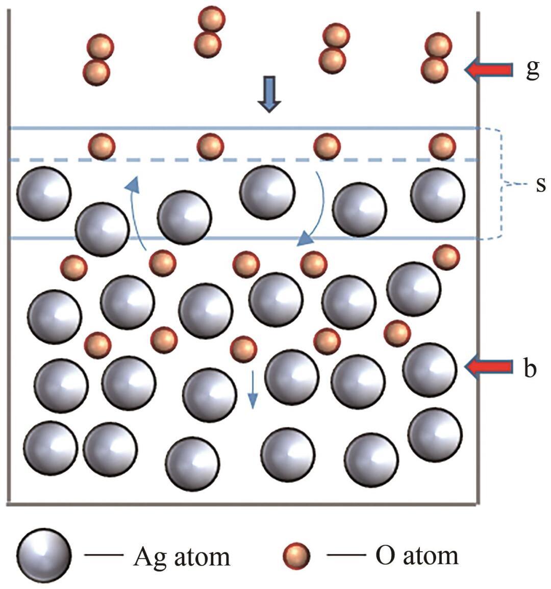 根據(jù)圖1,首先O2分子從氣相(g)擴(kuò)散至表面相(s);其次在Ag的催化下解離為O原子,并發(fā)生化學(xué)吸附;最后,O原子從表面相(s)擴(kuò)散至本體相(b)。整個(gè)過(guò)程可以表示為: