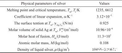 式(7)表示在整個(gè)溫度范圍內(nèi),液態(tài)Ag的表面張力與溫度的關(guān)系,相關(guān)參數(shù)的取值列于表1[21-26]。
