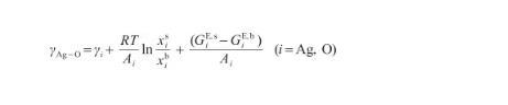 式中,γAg-O表示Ag-O系的表面張力(N/m),γi表示純組分i的表面張力(N/m),R為氣體常數(shù)[J/(mol·K)],x和x分別表示組分i在表面相和本體相中的摩爾分?jǐn)?shù)(mol/mol),Ai為組分i的摩爾表面積(m2/mol),G和G分別表示表面相和本體相中組分i的偏摩爾過(guò)剩自由能(J/mol),并且G=λG,其中λ為表面相和本體相的原子配位數(shù)之比[27]。G可由摩爾過(guò)剩自由能GE,b表示,其關(guān)系式為: