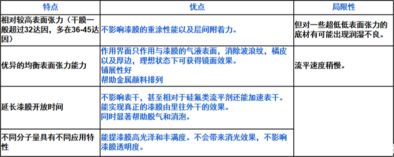 常見的丙烯酸酯類和聚酯類流平劑的一些典型應用特性: