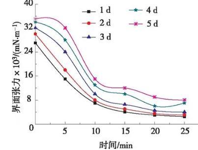 驅油體系在巖石表面的吸附損耗量越高,驅油成本就越高。因此,考察DQ-2在不同老化時間條件下體系的穩定性和界面性能,具體實驗方法參見1.4.4吸附性能測定,實驗結果見圖5。隨著巖心吸附時間的延長,油水界面張力逐漸增大,但均可達到10-3級別。實驗得出,巖心對該體系具有一定的吸附作用,但吸附量比較少,同時巖心對該體系的界面張力影響較小。體系DQ-2具有良好的吸附穩定性。