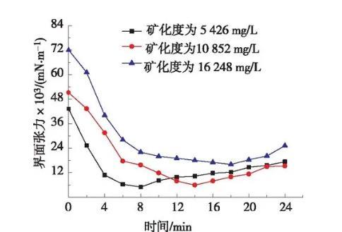 由圖3可知,隨著礦化度的增加,體系的油水界面張力呈現先大幅降低后緩慢增加的趨勢,而且隨著礦化度的增加,體系達到最低界面張力的時間不斷增加。在目標油藏礦化度條件下,體系油水界面張力8 min內可達到4.96×10-3mN/m,但當礦化度達到16 278 mg/L時,體系的最低界面張力無法達到10-3級別,主要是由于礦化度過高,破壞了體系的雙電子層。實驗結果表明,該體系在礦化度為5 426 mg/L具有較好的耐鹽性。