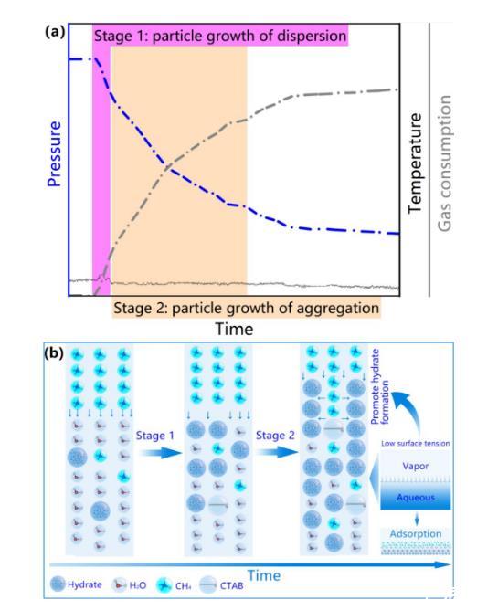 結合微觀與宏觀尺度的實驗結果,該研究總結出兩階段水合物生長模式——第一階段為顆粒分散生長過程、第二階段為顆粒聚集生長過程(圖2)。