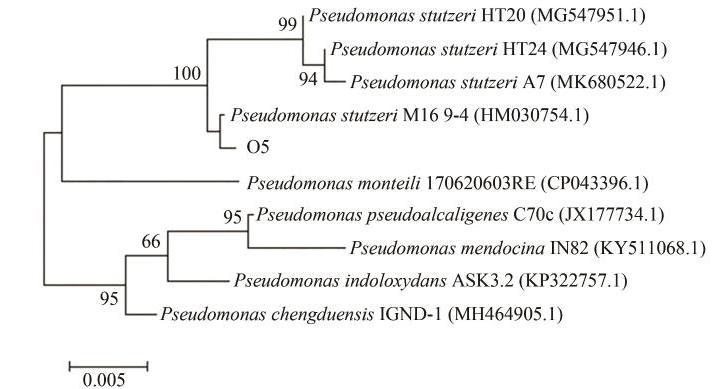 利用16S rRNA基因測(cè)序?qū)闛5進(jìn)行鑒定,將測(cè)序結(jié)果通過(guò)NCBI數(shù)據(jù)庫(kù)中的BLAST進(jìn)行比對(duì)分析,發(fā)現(xiàn)菌株O5與假單胞菌的同源性最高,為99.87%。利用MEGA軟件構(gòu)建系統(tǒng)發(fā)育樹(圖4)。由圖4可知,菌株O5和施氏假單胞菌Pseudomonas stutzeri M16-9-4位于進(jìn)化樹的同一分支中,親緣關(guān)系最相近。綜合形態(tài)特征鑒定,鑒定菌株O5為施氏假單胞菌(Pseudomonas stutzeri),命名為Pseudomonas stutzeri O5。