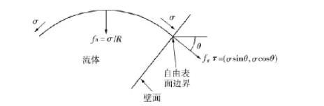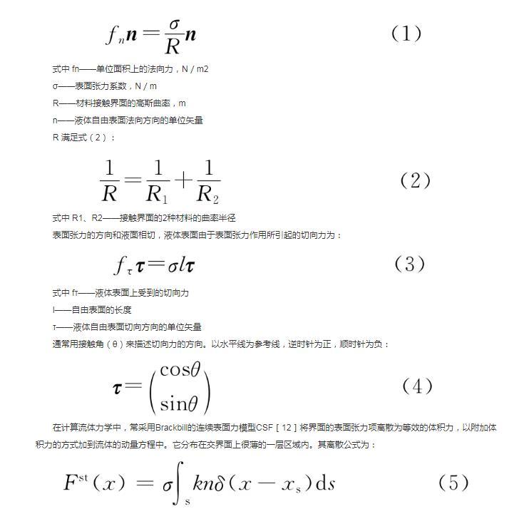 在計算流體力學中,常采用Brackbill的連續表面力模型CSF 將界面的表面張力項離散為等效的體積力,以附加體積力的方式加到流體的動量方程中。它分布在交界面上很薄的一層區域內。其離散公式為:
