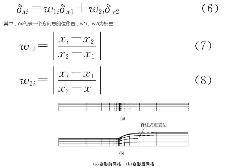 在數值模擬時,熔體自由表面在模擬的過程中會發生變形,自由表面的網格會因為自由表面位置的變化而發生變化。此時,需要采用網格重置技術。網格重置可以根據邊界點的位置的變化重新定位內部網格節點。Spine法是一種比較簡單,適用于二維擠出成型的網格重置方法。其網格節點是沿著線性進行重新組織的,如圖3所示。節點的位置確定是按照一維方式進行邏輯排列的,這就像是對二維平面進行切片,切片的方式是沿著自由表面或者移動邊界的法向方向,從而得到最終的網格。Spine法是線性組織的,并且在每個線段的端點處都有相應的節點。假設x1、x2是線段的2個端點。按照Spine法的規則,內部節點的位移數學表達式為: