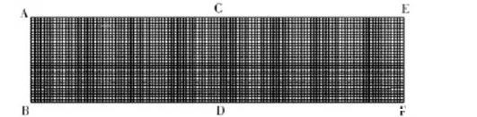 采用聚合物專用流體分析軟件Polyflow,對圓形截面的流道進行模擬分析,探討表面張力的尺寸效應及表面張力系數和接觸角對微擠出流場的影響。由于流道結構及流場的對稱性,本模擬采用軸對稱分析。模擬分析的流道尺寸及網格劃分如圖2所示。微通道尺寸AE=4×AB=1.2mm。網格采用四邊形結構單元。節點數量為3751,網格數量為3600。