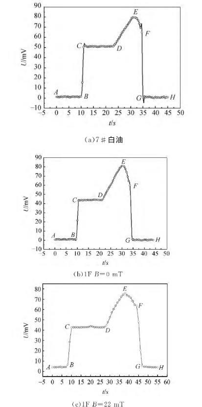 使用拉脫法測(cè)量了磁性液體的磁表面張力,無外加磁場(chǎng)作用時(shí),磁性液體的表面張力小于其載液的表面張力,磁性液體液膜拉得更長(zhǎng),液膜收縮的趨勢(shì)比白油更明顯,這主要是因?yàn)榇判砸后w中加入的表面活性劑降低了其表面張力。由液膜拉脫過程電壓變化曲線可觀察到:不同條件下磁性液體的電壓變化情況不同,無外加磁場(chǎng)作用時(shí)2F號(hào)磁性液體在EF階段存在轉(zhuǎn)折點(diǎn)Q,越過轉(zhuǎn)折點(diǎn),QF階段電壓變化較平緩,且表面張力越小;而7#白油和1F磁性液體并未出現(xiàn)此現(xiàn)象,這主要是因?yàn)?#白油和1F磁性液體表面張力較大,2F號(hào)磁性液體由于表面張力較小,其液體分子與分子之間的作用力較弱,宏觀表現(xiàn)為拉脫的液膜更長(zhǎng),液膜在空氣中會(huì)存在一段時(shí)間。有外加磁場(chǎng)作用時(shí),2F號(hào)磁性液體在FG階段并未出現(xiàn)電壓變化平緩的中間過程,但FG階段出現(xiàn)了另一些數(shù)據(jù)點(diǎn),液膜破裂的時(shí)間大于無外加磁場(chǎng)作用時(shí)的時(shí)間,主要是由于外加磁場(chǎng)增強(qiáng)了磁性顆粒之間的相互作用,分子和分子之間的磁吸引力增強(qiáng),導(dǎo)致液膜逐步破裂。