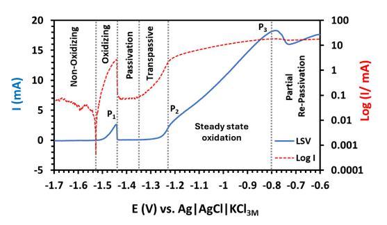 圖1電化學線性掃描伏安圖(LSV,藍色實線)及液滴電流的對數(shù)圖(紅色虛線),針對1 M NaOH中的鎵銦合金,掃描速率為0.5 mV/s。垂直虛線將圖中標記的六個反應區(qū)域區(qū)分開來,標記出三個氧化峰P1、P2和P3。
