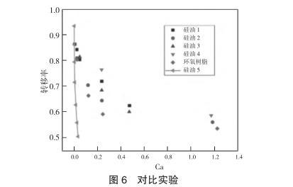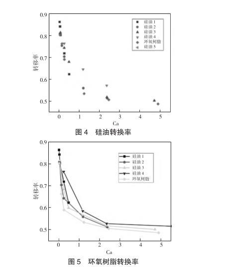 對(duì)不同黏度以及拉伸速度下的膠液進(jìn)行測(cè)量并計(jì)算轉(zhuǎn)移率,如圖4所示,在忽略慣性力的條件下,采用無(wú)量綱數(shù)Ca來(lái)表示轉(zhuǎn)移率,對(duì)于表面張力相似且不同黏度的四種甲基硅油的轉(zhuǎn)移率有著相似的收斂情況。為了進(jìn)一步印證Ca對(duì)轉(zhuǎn)換率的影響,引入與甲基硅油不同表面張力的環(huán)氧樹(shù)脂進(jìn)行對(duì)比實(shí)驗(yàn),如圖5所示,表面張力較大的環(huán)氧樹(shù)脂的轉(zhuǎn)換率會(huì)比甲基硅油小,但整體趨勢(shì)相差不大,均會(huì)收斂到一定數(shù)值。之后,為了了解慣性力對(duì)轉(zhuǎn)移率的影響,選擇黏度較小的膠液進(jìn)行實(shí)驗(yàn),同時(shí)加大移液針直徑使其脫離微量點(diǎn)膠的范圍,以提高慣性力對(duì)膠液傳遞的影響,如圖6所示,在通過(guò)增加膠液體積以提高慣性力影響的實(shí)驗(yàn)中,膠液轉(zhuǎn)移率的變化與之前有極大差異。