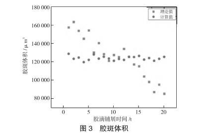 在液橋斷裂后,轉(zhuǎn)移到點(diǎn)膠面上的膠液在自身表面張力的作用下形成圓潤(rùn)的膠斑,在理想狀態(tài)下膠斑可視為球冠狀,其體積可用球冠狀公式求得。實(shí)驗(yàn)主要使用的膠液為甲基硅油,其表面張力只有21 mN/m,低于環(huán)氧樹(shù)脂,在基板上由甲基硅油形成的膠斑在穩(wěn)定狀態(tài)下與環(huán)氧樹(shù)脂的形狀不同,因此不能將其視為球冠狀,需要其他計(jì)算體積的方法。為了提高計(jì)算的準(zhǔn)確性通過(guò)灰度處理、二值化等圖像處理的方法提取膠斑的輪廓信息,之后通過(guò)提取到的坐標(biāo)信息來(lái)擬合膠斑輪廓的函數(shù),使用旋轉(zhuǎn)積分的方法來(lái)計(jì)算膠斑的體積。之后為了驗(yàn)證計(jì)算的準(zhǔn)確性,在其他物性條件相同時(shí),將5 000 cps的甲基硅油、3 mm/s的移液針抬升速度的實(shí)驗(yàn)條件下膠斑的鋪展過(guò)程作為研究對(duì)象。用顯微鏡錄制在液橋斷裂后膠斑的鋪展情況,以0.016 s為間隔,截取20張膠斑的圖片分別用公式和積分法進(jìn)行膠斑體積的計(jì)算,結(jié)果如圖3所示。