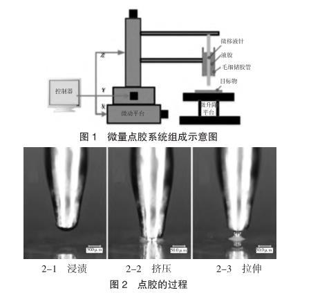 本課題組研制了一種基于移液針轉(zhuǎn)印原理的微量點(diǎn)膠系統(tǒng),該點(diǎn)膠系統(tǒng)所形成的膠斑直徑可達(dá)到數(shù)十微米,膠滴體積可達(dá)飛升-皮升的范圍。該系統(tǒng)的結(jié)構(gòu)如圖1所示。該系統(tǒng)由出膠單元、驅(qū)動(dòng)單元和控制單元組成。其中,出膠單元為系統(tǒng)的核心,其主要包含微移液針和毛細(xì)儲(chǔ)膠管兩個(gè)關(guān)鍵元件,移液針通過(guò)在儲(chǔ)膠管內(nèi)的上下往復(fù)運(yùn)動(dòng),實(shí)現(xiàn)膠液向基板的微量轉(zhuǎn)移。驅(qū)動(dòng)單元由X/Y/Z三個(gè)方向的驅(qū)動(dòng)電機(jī)和微升降平臺(tái)組成,用于驅(qū)動(dòng)微移液針及點(diǎn)膠工件的運(yùn)動(dòng)。控制單元由PLC控制系統(tǒng)和LaBview開(kāi)發(fā)的控制面板組成,實(shí)現(xiàn)對(duì)電機(jī)運(yùn)動(dòng)的自動(dòng)控制。