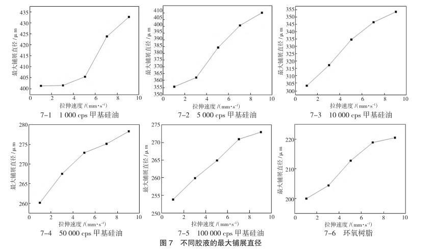 點(diǎn)膠結(jié)果最直觀的顯示就是形成膠斑達(dá)到穩(wěn)定狀態(tài)時(shí)膠斑的直徑,因此對(duì)膠斑的直徑進(jìn)行研究。選取5種表面張力相似黏度不同的甲基硅油以及黏度為10 000 cps的環(huán)氧樹(shù)脂作為實(shí)驗(yàn)用膠。移液針抬升速度分別設(shè)置為1 mm/s,3 mm/s,5 mm/s,7 mm/s,9 mm/s。使用的移液針直徑為200μm。實(shí)驗(yàn)結(jié)果如圖7所示。
