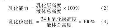 準確稱取1.0 g棕櫚酸木薯淀粉酯,加入一定量的水,于沸水浴中完全糊化,冷卻至室溫。加入20 mL植物油,磁力攪拌2 h,得到均勻乳狀液。將乳狀液轉(zhuǎn)移至10 mL離心管中,在3 000 r/min轉(zhuǎn)速下離心15 min,記錄乳化層高度和液體總高度。將乳液于室溫下放置24 h,再以3 000 r/min轉(zhuǎn)速離心15 min,記錄乳化層高度和液體總高度。平行3次,取平均值。按式(2)和式(3)計算乳化能力及乳化穩(wěn)定性。