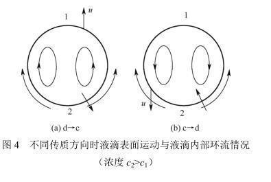 傳質(zhì)方向?qū)Ψ稚⑾鄿媛实挠绊懯怯捎贛arangoni效應(yīng)影響液滴破碎和聚并引起的。圖2和圖3中傳質(zhì)方向為d→c的分散相滯存率遠(yuǎn)高于傳質(zhì)方向c→d的,原因在于本實驗所用的正丁醇-丁二酸-水體系是界面張力隨濃度增加而減小的體系(即?γ/?c<0)。在?γ/?c<0體系的d→c傳質(zhì)過程中[如圖4(a)所示],界面張力梯度導(dǎo)致液滴表面的運動方向與液滴內(nèi)部環(huán)流方向相同,有利于液滴的破碎。而c→d的傳質(zhì)過程[如圖4(b)所示],界面張力梯度的方向不變,但液滴內(nèi)部環(huán)流方向卻恰好相反,內(nèi)部與外部兩種力量相互抵消,液滴相對較穩(wěn)定,破碎的概率大大減小。所以,d→c的分散相滯存率明顯高于相反方向。