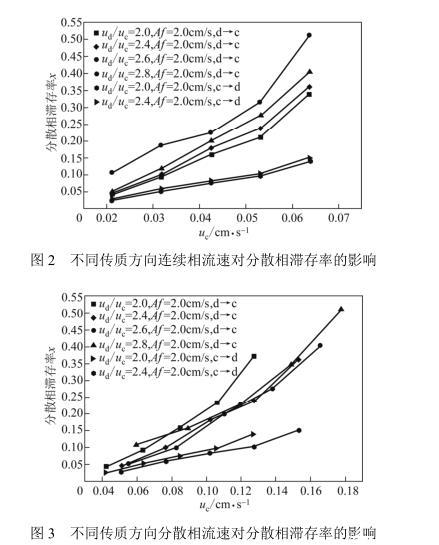圖5是篩板在不同振動速率下的分散相滯存率變化情況。圖中結(jié)果顯示:分散相滯存率隨著篩板振動速率Af的增加而增大。振動的篩板對液滴有強烈的剪切作用,加速了液滴破碎、聚并和再破碎過程,固分散相滯存率隨Af增大。