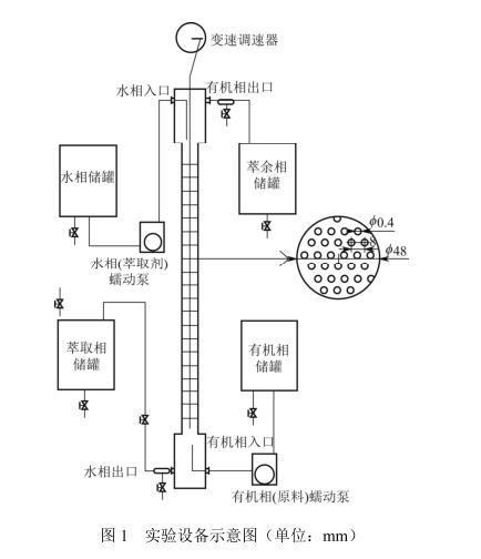 水相和有機相分別通過可調(diào)節(jié)流速的蠕動泵進入塔內(nèi),兩相在塔內(nèi)實現(xiàn)逆流接觸傳質(zhì)后分別從塔底和塔頂?shù)某隹诹鞒鲞M入各自儲罐。實驗中溶質(zhì)丁二酸從有機相向水相傳遞,有機相和水相分別作分散相,以此來考察溶質(zhì)從分散相到連續(xù)相(d→c)和從連續(xù)相到分散相(c→d)不同傳質(zhì)方向?qū)腿⌒Ч挠绊憽?