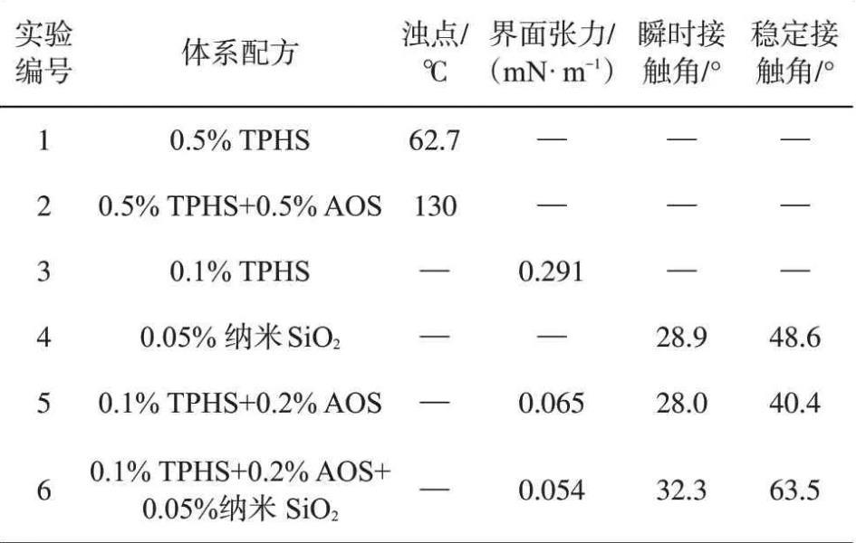 表面活性劑之間通過復配可以彌補其性能單一的缺點。陰離子表面活性劑和非離子表面活性劑的復配使其具有良好的協同效應,既可彌補陰離子表面活性劑不耐鈣鎂離子的不足,又可以提高非離子表面活性劑的濁點。由于TPHS的親水基為非離子基團,復配陰離子表面活性劑AOS可以提高表面活性劑的濁點,實驗結果如表1所示,TPHS與AOS復配后,濁點大大提高;TPHS在地層吸附量較大,復配納米SiO2在減少地層吸附的同時可以提高滲吸速率。0.1%TPHS、0.05%SiO2、0.1%TPHS+0.2%AOS和0.1%TPHS+0.2%AOS+0.05%SiO2體系與原油間的界面張力及其在親水載玻片上的接觸角測試結果如表1所示。在80℃下,復合體系0.1%TPHS+0.2%AOS和0.1%TPHS+0.2%AOS+0.05%SiO2與原油間的界面張力均達到10-2mN/m數量級,與TPHS單一表面活性劑相比,復配體系更有效地降低了油水界面張力。在納米SiO2與表面活性劑的協同作用下,低張力納米流體(0.1%TPHS+0.2%AOS+0.05%SiO2)在親水載玻片上的接觸角遠大于單獨納米SiO2或表面活性劑的溶液的。這是因為表面活性劑在納米SiO2顆粒表面的吸附使得玻璃表面親水性能減弱,因而使得接觸角增大,這一現象說明低張力納米流體有較好的潤濕性能。