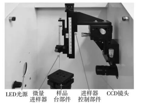 實(shí)驗(yàn)采用SL200A型接觸角儀來產(chǎn)生液滴,獲取液滴圖像。該儀器的主機(jī)如圖2所示,主要組成部件為:光源控制部件(可調(diào)亮度LED光源)、CCD鏡頭(75 mm焦距,25幀/秒)、進(jìn)樣器控制部件(可升降12.5 mm,0.01 mm微距)、樣品臺部件(樣品臺面50×50 mm)、圖像采集卡(25幀/秒)、手動控制微量進(jìn)樣器(10、25、50μL)。實(shí)驗(yàn)采用表面張力與接觸角分析系統(tǒng)的CAST2.0軟件控制拍攝過程。采用連續(xù)拍攝方式,圖像采集速率為25幀/s,連拍100幀,獲取液滴圖像。實(shí)驗(yàn)樣品為黏度系數(shù)為50 mm2/s、100 mm2/s、350 mm2/s、500 mm2/s的硅油,其中黏度系數(shù)為50 mm2/s、100 mm2/s的硅油密度σ為965 kg/m3,黏度系數(shù)為350 mm2/s、500 mm2/s的硅油密度σ為970 kg/m3[14]。
