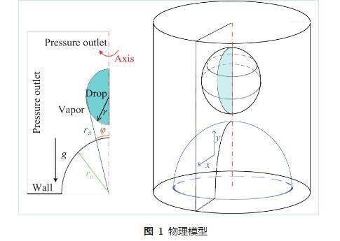 雖然,很多學(xué)者對Leidenfrost現(xiàn)象進(jìn)行了一定研究,但是大部分研究成果聚焦于高溫平面上的液滴動力學(xué)與傳熱特性,而非平面上Leidenfrost現(xiàn)象的研究非常有限。但是,液滴撞擊高溫曲面廣泛存在于電子工程、機(jī)械工程、動力工程、化學(xué)工程等領(lǐng)域。如液滴撞擊高溫球面,常見于流化催化裂化和流化焦化等工藝,這一過程影響著多種過程系統(tǒng)的性能,尤其是對于生產(chǎn)更有價值的汽車燃料具有重要意義。鑒于此,本文進(jìn)一步探究液滴與高溫球面撞擊過程中液滴的Leidenfrost現(xiàn)象,采用數(shù)值模擬方法進(jìn)行研究,使用Fluent軟件構(gòu)建了二維軸對稱數(shù)值模型,采用VOF模型及Lee模型,分析液滴撞擊高溫球面的動力學(xué)特性與傳熱特性,探討Leidenfrost現(xiàn)象的機(jī)理及各因素的影響規(guī)律。