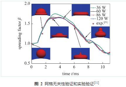 為了定量分析網(wǎng)格數(shù)量對數(shù)值模擬結(jié)果準(zhǔn)確性的影響,以液滴撞擊壁面時的鋪展因子作為定量分析指標(biāo)及網(wǎng)格無關(guān)性驗(yàn)證的評判標(biāo)準(zhǔn)。網(wǎng)格數(shù)量從36 w開始增加,每次增長大約30 w,并繪制液滴鋪展因子β隨時間變化與網(wǎng)格數(shù)量的關(guān)系圖。如圖2所示,網(wǎng)格數(shù)在86 w以上時基本不會對模擬結(jié)果產(chǎn)生影響,為保證模擬精度并確保求解時間,本文采用86 w網(wǎng)格數(shù)作為模型的基準(zhǔn)網(wǎng)格數(shù)進(jìn)行模擬。從圖中也可以看出,數(shù)值模擬結(jié)果與參考文獻(xiàn)中的實(shí)驗(yàn)結(jié)果趨于一致,說明本文采用的模型可以用于研究液滴撞擊球面的Leidenfrost現(xiàn)象。