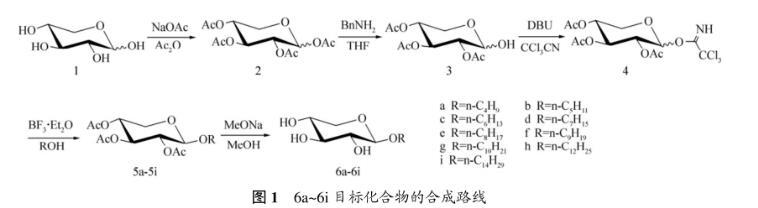 采用全乙?;哪咎?2)在四氯化錫催化下與一系列脂肪醇發(fā)生偶聯(lián)反應,對時間要嚴格控制,否則有部分轉(zhuǎn)化成α-異構(gòu)體,當時間過長時,還會形成以α-糖苷為主的產(chǎn)物和少量2-位脫保護的糖苷副產(chǎn)物。參考烷基-β-D-葡萄糖苷等合成與性能研究成果,按照Scheme1所示的路線,以D-木糖(1)為原料通過乙?;⒚?-位乙?;?、與三氯乙腈反應,得到相應的三氯乙酰亞胺酯(4)。采用易于構(gòu)筑1,2-反式糖苷鍵的三氯乙酰亞胺酯法,以三氟化硼乙醚作糖苷化偶聯(lián)反應的催化劑,使得具有鄰基參與效應的三氯乙酰亞胺酯(4)與相應的脂肪醇反應及相應的脫乙?;Wo,合成一系列烷基-β-D-吡喃木糖苷,如圖1所示。本文作者對其溶解性、表面張力、乳化性能、液晶性能、熱穩(wěn)定性等理化性質(zhì)進行研究。