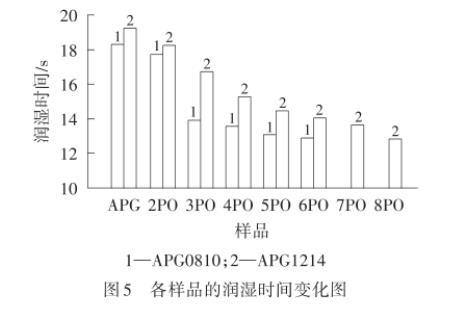 由圖5可以看出,APG0810PE-n和APG1214PEm的潤濕時間隨著PO加合數(shù)的增加而減少。這是因為表面活性劑在濕潤帆布片時,PO基團的引入為分子提供疏水性,提高了分子與帆布片之間的疏水相互作用,促使分子易于吸附在帆布片表面,有利于潤濕。而APG1214和APG1214PE-m的潤濕時間比APG0810和APG0810PE-n長,說明隨著碳鏈增長,潤濕性能變差,這是因為分子長度增加打破了親水親油平衡狀態(tài),不利于潤濕。