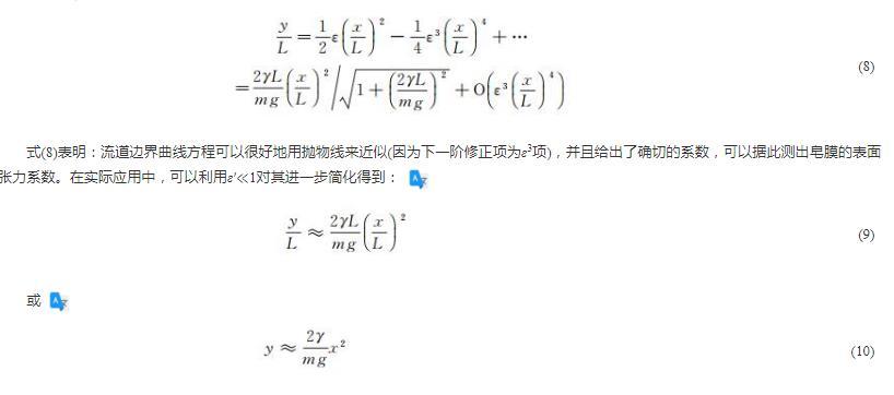 Sane等推導了表面張力系數與尼龍繩曲線方程的關系,但并未獲得曲線方程的精確解,而是采用高階多項式對實測曲線進行擬合,發現選取二階多項式可以得到較好的結果,從而也獲得了式(10),并通過擬合系數得到了表面張力系數。本文的嚴格推導說明:流道邊界曲線是拋物線加上高兩階小量的修正。圖(2)也證明了這一推導結論的正確性。