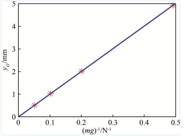 圖3給出了在同一皂液流量Q=35 mL/min下測得的流道中點O的位移隨砝碼質量的變化以及根據式(11)擬合的直線。所有數據點都很好地落在過原點的擬合直線上,進一步驗證了本文推導的正確性。根據直線斜率測得的表面張力系數γ=27.1 mN/m,與前述拋物線擬合法得到的結果相近。