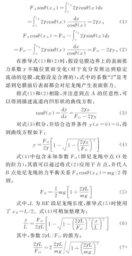 如圖1(a)所示,尼龍繩BE和CD下方懸掛質量為m的砝碼以施加張力、保持流道穩定。當沒有皂液流動時,尼龍線BE和CD在砝碼作用下保持鉛直;當皂液流入流道形成皂膜,尼龍繩BE和CD在皂膜表面張力的作用下向皂膜側略微收縮,形成微微內凹的流道(圖中對內凹程度有所放大)。從力平衡的角度出發,推導出該內凹曲線的形狀與皂膜表面張力系數的關系,可以給出一種測量流動皂膜表面張力系數的方法。