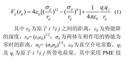 在計算過程中,綜合考慮了系統內分子間非鍵結作用力(范德華力、庫倫靜電力)及分子內鍵結作用力(鍵拉伸和鍵彎曲)。分別采用Lennard-Jones勢能函數模擬范德華力,庫侖定律模擬庫侖靜電力,具體分子間勢能函數如式(1)所示
