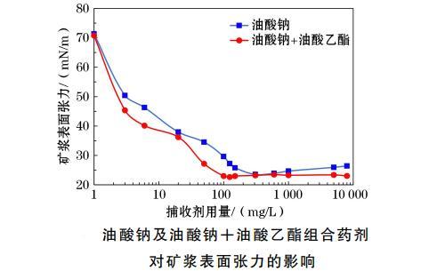 圖3油酸鈉及油酸鈉+油酸乙酯組合藥劑對礦漿表面張力的影響