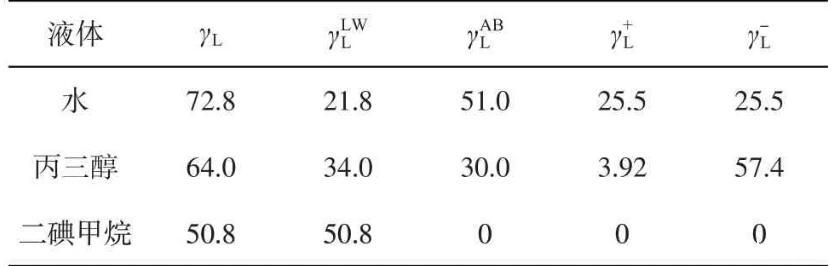 根據(jù)DLVO擴(kuò)展理論,首先分別通過式(5)和式(6)計(jì)算LW相互作用自由能(和AB相互作用自由能()。然后,通過式(7)計(jì)算去離子水溶液中的液-固界面作用能()。