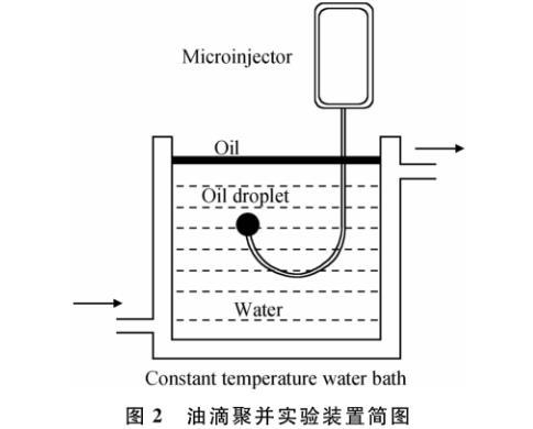 以甲苯與正庚烷(體積比為1/1)為溶劑,將不同原油組分配制成為質量分數1%的溶液作為油相,以模擬殘余HMPAM溶液為水相,利用如圖2所示的實驗裝置:由微量注射泵、彎鉤以及可加熱水槽組成,開展油滴聚并實驗以評價液滴穩(wěn)定性(或界面穩(wěn)定性)。利用微量注射泵(可間斷注射)通過彎鉤注射30個30μL的油滴,由于密度差的原因,油滴會在樣品池中上浮;在樣品池上層有一層油相,油滴上浮碰到油相時開始計時,當油滴完全和油相融合時停止計時,這一段時間可以定義為油滴的聚并時間;這期間的過程利用快速攝像錄下,然后分楨計算后,得到所需聚并時間。