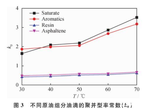 圖3為不同原油組分油滴的聚并速率常數。由圖3可知,不同溫度下膠質和瀝青質油滴的聚并速率常數遠小于飽和分和芳香分,即在含聚水相中由膠質和瀝青質形成的油-水界面穩(wěn)定性更高,破裂更難。換言之,可使油滴在含聚水相中穩(wěn)定存在的原油組分為膠質和瀝青質,其中膠質的穩(wěn)定性作用大于瀝青質。瀝青質、膠質是鍵接各種極性基團(主要有含氧、含硫和含氮基團,如羰基、羧基、羥基、酚羥基、硫醚、吡咯和吡啶等)的大分子有機化合物,在油-水界面具有較強的界面活性,故可穩(wěn)定油滴。一般而言,膠質的相對分子質量及極性基團含量均小于瀝青質。膠質的穩(wěn)定性作用大于瀝青質,可能是由于其相對分子質量小,分子間作用力小于瀝青質分子間作用力,所以有可能膠質更易與含聚水相中的聚合物發(fā)生作用,從而增強油滴穩(wěn)定性。