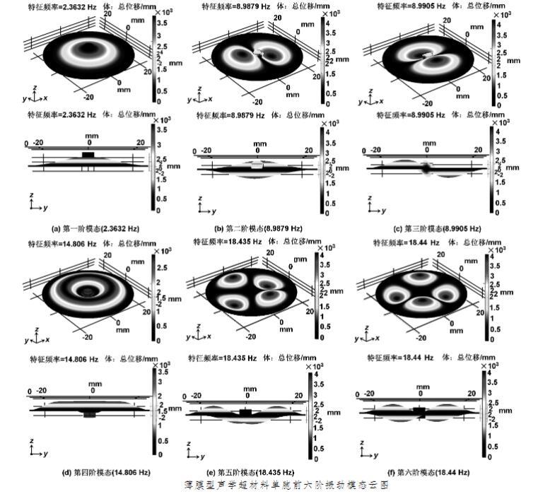 考慮聲波對薄膜的影響,在聲場仿真前進行模態分析以研究其在特定頻段聲波下的響應形態。使用COMSOL建立MAMs單胞模型進行模態仿真。