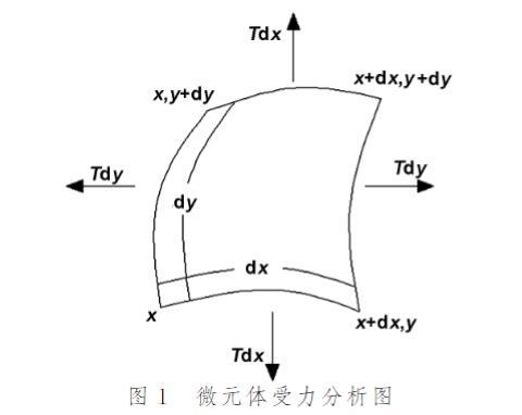 分析薄膜振動需進行受力分析。薄膜所受內力僅為張力。設單位長度薄膜張力為T(N/m),單位面積質量為ρ。取薄膜平衡位置在xy平面內的微元體分析(圖1),當其受到垂直xy面的外力擾動后,會在張力T作用下產生橫向振動,恢復力主要為張力。