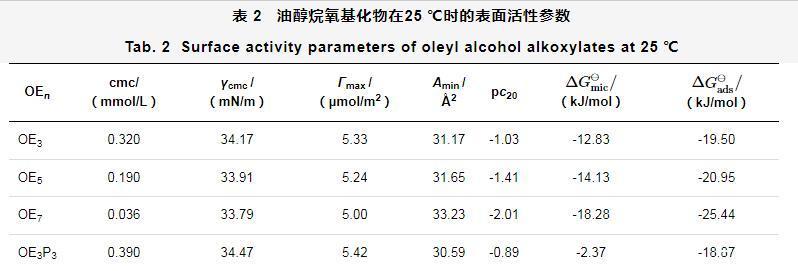 OEn的Amin值分別為31.17,31.65和33.23?2(見表2),其值隨著EO加合數的增加變化不大,但呈現逐漸增大趨勢,而Γmax變化呈相反的趨勢。這是因為隨著分子中EO數的增多,EO鏈形成卷曲結構使單個表面活性劑分子頭基的體積增大,進而引起在界面處達到飽和狀態時表面活性劑分子數目減少;但同時因為OEn分子中EO加合數相差不大,因此OEn的Amin值和Γmax值整體上變化不大。OEn的Amin值比課題組以前合成的OEnS(n=3,5,7)的Amin值(81.62~125.79?2)小[19],這是因為本文中的OEn為非離子表面活性劑,而OEnS是典型的陰離子表面活性劑,由于親水頭基之間強的相互排斥作用,使得OEnS分子在空氣/水在界面上的聚集相對分散一些,從而使得Amin值增大。由表2可以看出,?Gmic和?Gads都為負值,說明吸附和膠束化過程都是自發的過程,而?Gads要比?Gmic的值更負,說明在水溶液中吸附過程要比膠束化過程更容易進行。OEn的?Gmic和?Gads都隨著EO加合數的增加而更負,說明隨著EO加合數的增大,OEn更容易在界面上吸附和在水溶液中形成膠束。從表2中還可以看出,OE3P3的表面活性參數與OE3相差不大,說明在OE3的結構中引入3個PO基對其表面性能的影響不大。