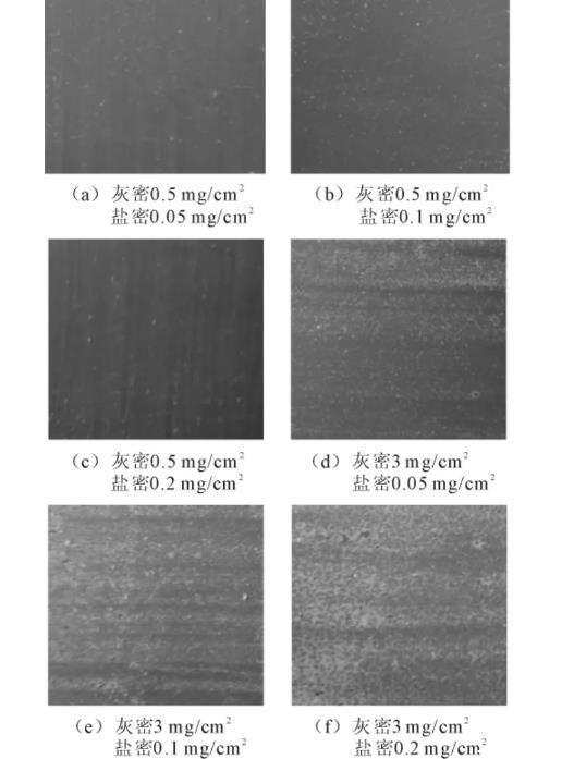 結合電力系統線路運行環境,對自然污穢分布和種類進行研究,得到兩份混合成分鹽溶液的離子成分配比,配置溶液的含鹽質量與濃度為0.021 4 mol/L的50 mL的NaCl鹽溶液相同。第一份模擬的是在經濟發達地區交通繁忙路段附近的典型污穢成分,選用的鹽為:NaNO3、KCl、NH4Cl、CaSO4,其相應的質量分數比為17.68:3.35:5.19:54.54;第二份模擬的是火電廠、煤礦和焦化廠等工業區附近典型污穢物成分,選用的鹽為:NaCl、KCl、NH4Cl、CaSO4、MgSO4,相應的質量分數比為:74:10.6:2.98:66.34:2.1。