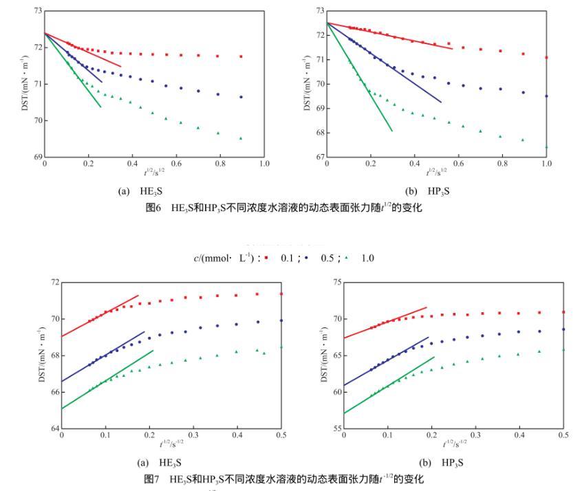 2)水溶液中的HE3S和HP3S分子可以快速擴散到氣-液界面,迅速降低表面張力并達到平衡值,對于低濃度水溶液,這兩種表面活性劑的吸附過程都屬于混合動力控制吸附。