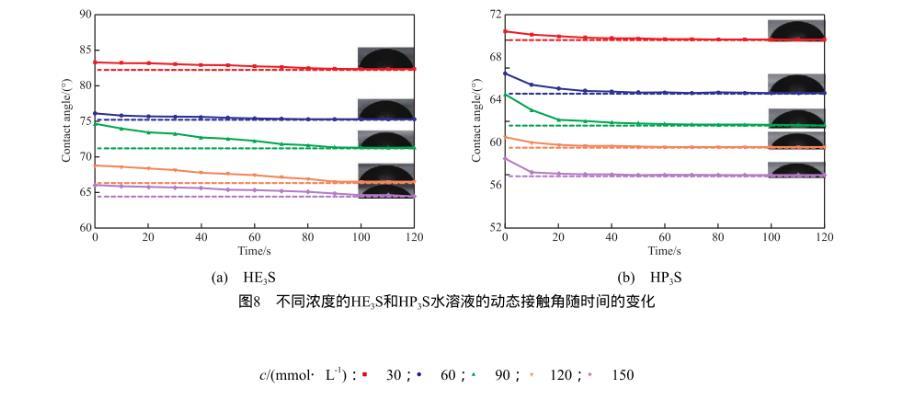 3)當溶液濃度為150 mmol/L時,HE3S和HP3S的水溶液液滴可在石蠟膜上快速鋪展,該性質與其動態表面張力結果相對應。而且在一定濃度范圍內隨濃度增大,液滴可以更快的達到更低的接觸角,其最低接觸角分別達到64.5°和55.9°。
