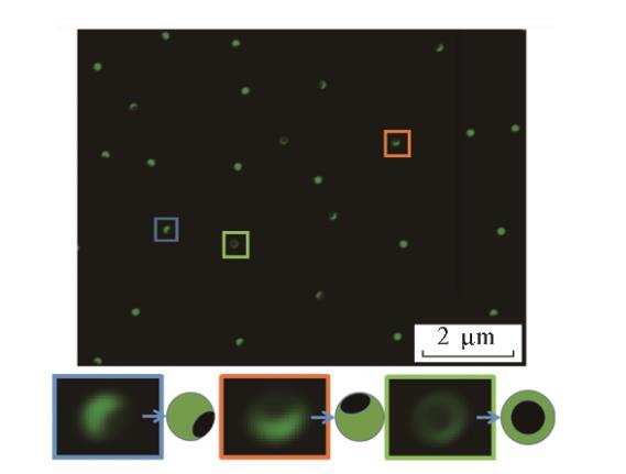 為了驗證合成的Janus顆粒表面具備非對稱結構,對涂覆APS的顆粒表面接枝熒光劑FITC。結果如圖3所示,熒光Janus顆粒表面一側的熒光性明顯比另一側更強,并且熒光部分所占面積大于非熒光部分。這不僅證實了所制備的Janus顆粒具有非對稱結構,也說明非對稱結構的兩個改性區域面積不相等。Janus顆粒表面接枝PFTS的一側出現微弱的熒光主要是由納米SiO?顆粒邊緣的熒光基團發出的亮光所產生的漫反射和散射造成的。