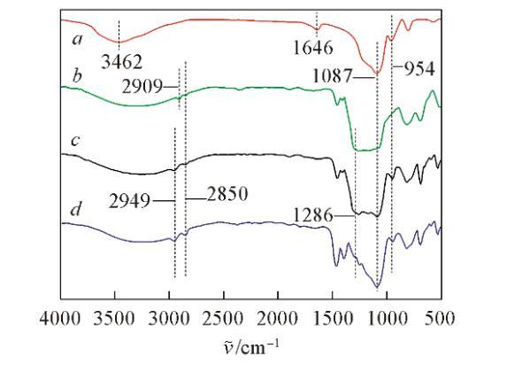 圖2為SiO?顆粒改性前后的紅外光譜圖。在裸露的SiO?顆粒(圖2譜線a)上,3459 cm?1處出現羥基的氫氧鍵伸縮振動吸收峰,1646 cm?1處是納米SiO?表面吸附水的氫氧鍵振動吸收峰,而在改性的顆粒上這2處吸收峰強度有所降低甚至消失,這是由于SiO?顆粒表面的硅羥基(Si—OH)與硅烷偶聯劑發生縮合反應而數量減少,并且改變了顆粒表面與水之間氫鍵的鍵合密度;在圖2譜線b~d中,2949處和2850 cm?1處的吸收峰可分別歸屬為甲基和亞甲基上的碳氫鍵伸縮振動;并且這些吸收峰強度增加,說明甲基和亞甲基數量增加。在1170~1286 cm?1間的峰為—CF?、—CF?的伸縮振動峰,由于—CF?、—CF?的伸縮振動峰與1087~1200 cm?1間的硅氧鍵伸縮振動吸收峰重合,從而導致圖2譜線b~d中1087~1286 cm?1間的吸收峰變寬,并且吸收峰強度依次減弱,說明—CF?、—CF?數量減少。綜上所述,可初步說明納米SiO?表面被不同比例的碳氫鏈和氟碳鏈覆蓋。