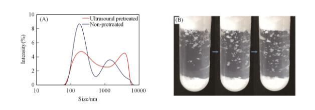 值得注意的是,如果粒子首先用超聲波分散在液體中,然后以相同的方式振蕩,則顆粒產生的泡沫高度有所下降[圖6(A)]。因此對比了振蕩和超聲波處理后的顆粒在液體中團聚體的粒徑大小。采用動態光散射儀間接表征了顆粒在液體中的團聚情況[圖7(A)]。可以看出,振蕩后的液體中有較多物質的粒徑大于單個顆粒直徑,而且粒徑分布很寬。這證明液體中存在明顯的顆粒團聚體。由于顆粒本身存在巨大的表面能,多數顆粒在空氣中已經自發團聚。顆粒在液體中大多也以團聚體的方式存在。少量空氣被密封在浸沒于油相中的顆粒團聚體內部,這部分不與外界聯通的空氣提供了額外的壓力,進而阻止了進一步滲透。這種顆粒團聚體表面同樣形成了由Cassie-Baxter方程描述的復合表面,該復合表面的形成保護了構成團聚體的顆粒不被完全潤濕,并使團聚體表面具有合理的疏油性(cosθ_CB的值接近0),從而在熱力學上團聚體便于發生吸附。而溶液經超聲波處理后顆粒被潤濕,團聚體被破壞使尺寸變小,并且均勻分布在溶液中。圖6(B)顯示了在經超聲波處理后的表面張力測試數據,同樣表明團聚體被破壞后,被潤濕的顆粒不再傾向于吸附在表面上。
