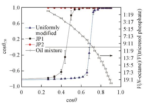 放置在靜止液體表面的顆粒的潤濕行為由圖5示出。隨著液體表面張力的增加,從光滑的氟碳鏈覆蓋的表面獲得的cosθ值同時增大,液體頂部的表面出現明顯的不溶顆粒。這種顆粒不潤濕的情況與顆粒形成粗糙表面測量的結果具有相關性。干燥的顆粒以蓬松狀態直接向油相傾倒,如果在油相表面能形成足夠強壯的、由顆粒組成的亞穩態Cassie-Baxter狀態,那么疏油表面將會形成,并阻止其它顆粒接觸油相,宏觀表現為顆粒不潤濕。相反,如果油相表面由顆粒組成的亞穩態Cassie-Baxter狀態魯棒性不足,在手動振蕩或重力作用下,顆粒或顆粒團聚體接觸油相并浸沒在油相中。亞穩態魯棒性與顆粒表面材料潤濕角密切相關,即不同類型的顆粒具有明顯不同的潤濕轉折點。JP1潤濕性轉折點位于均勻修飾顆粒右側,JP2沒有發現潤濕轉折點。這與顆粒上接枝的烷烴鏈數量有關。JP2上盡管存在氟碳鏈,但由于烷烴鏈覆蓋的面積太大,使顆粒整體表現出強烈的親油性。