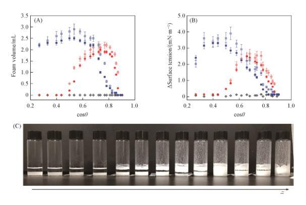 然而,顆粒在超聲波的作用下依舊產生了泡沫。這是由于顆粒數量多,顆粒團聚體尺寸變得十分巨大,并出現明顯沉淀。超聲波無法把這些團聚體完全破壞。受超聲波作用,團聚體被分散成更小的狀態,但依舊有十分明顯的沉淀。在用手劇烈振蕩之后,無論顆粒是否被超聲波處理過,均有機會重新形成更大的、肉眼可見的團聚體[圖7(B)],這說明顆粒團聚體是產生泡沫的關鍵。結合圖4和圖6結果,以粗糙表面代表的顆粒團聚體表面接觸角在θ_CB為90°(cosθ_CB=0)附近具有最多的泡沫體積和最大的表面張力降低值,而對應的θ均小于70.1°(cosθ > 0.39),這表明顆粒在油氣表面上吸附并起泡需要顆粒團聚體的Cassie-Baxter復合表面的接觸角θ_CB約為90°,而對應的顆粒的本征接觸角θ則小于70.1°,不需要單個顆粒潤濕角必須接近90°。